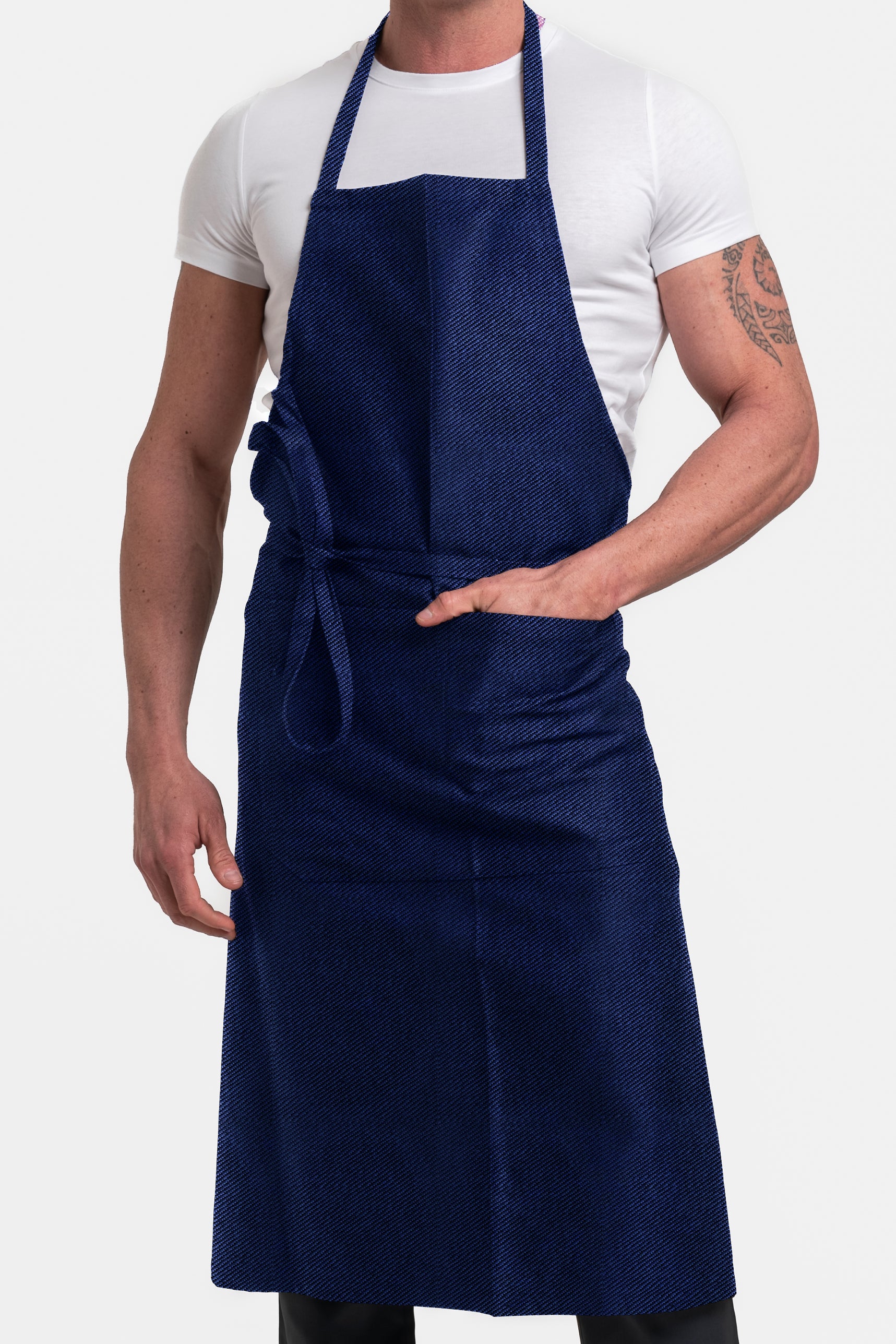 Equip yourself with a bib apron to achieve a stylish and contemporary look. The denim color provides a professional appearance while adding a touch of originality. With drawstrings at the back, you can easily secure the apron and tie an appropriate knot. The two front pockets allow for convenient storage of various items, including a mobile phone.