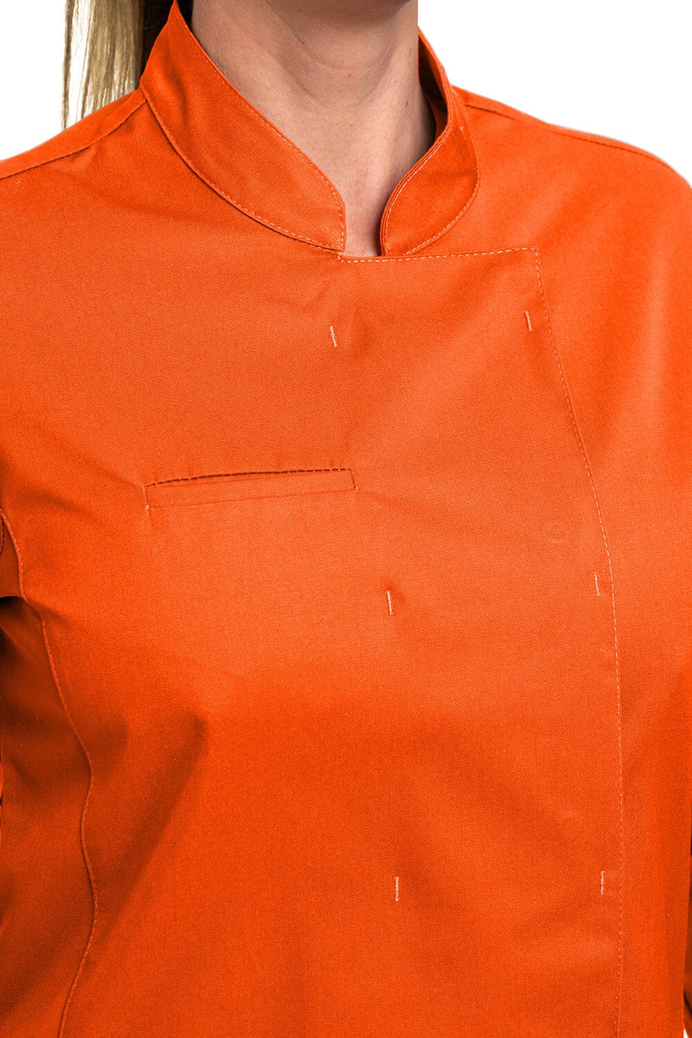 The Mandarin collar adds a modern, polished touch while remaining practical for kitchen work.