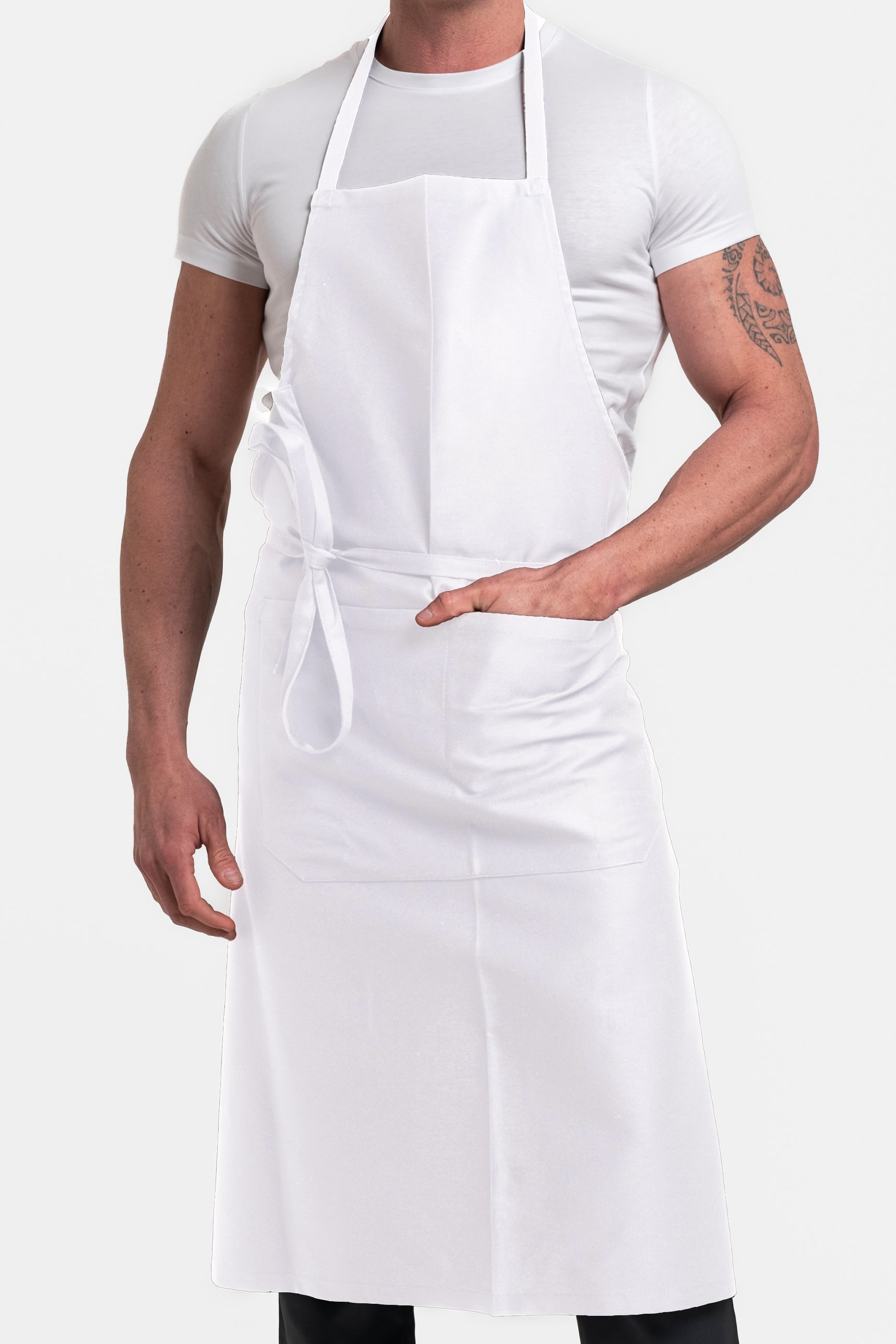 The Napoli White Bib Apron is made from 100% cotton, providing both comfort and durability for long kitchen hours.